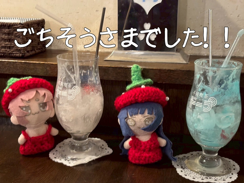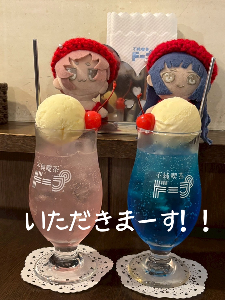 提供されたクリームソーダは釈迦堂と釈迦郡が見上げるほどの高さで、色鮮やかでキラキラしてました!
